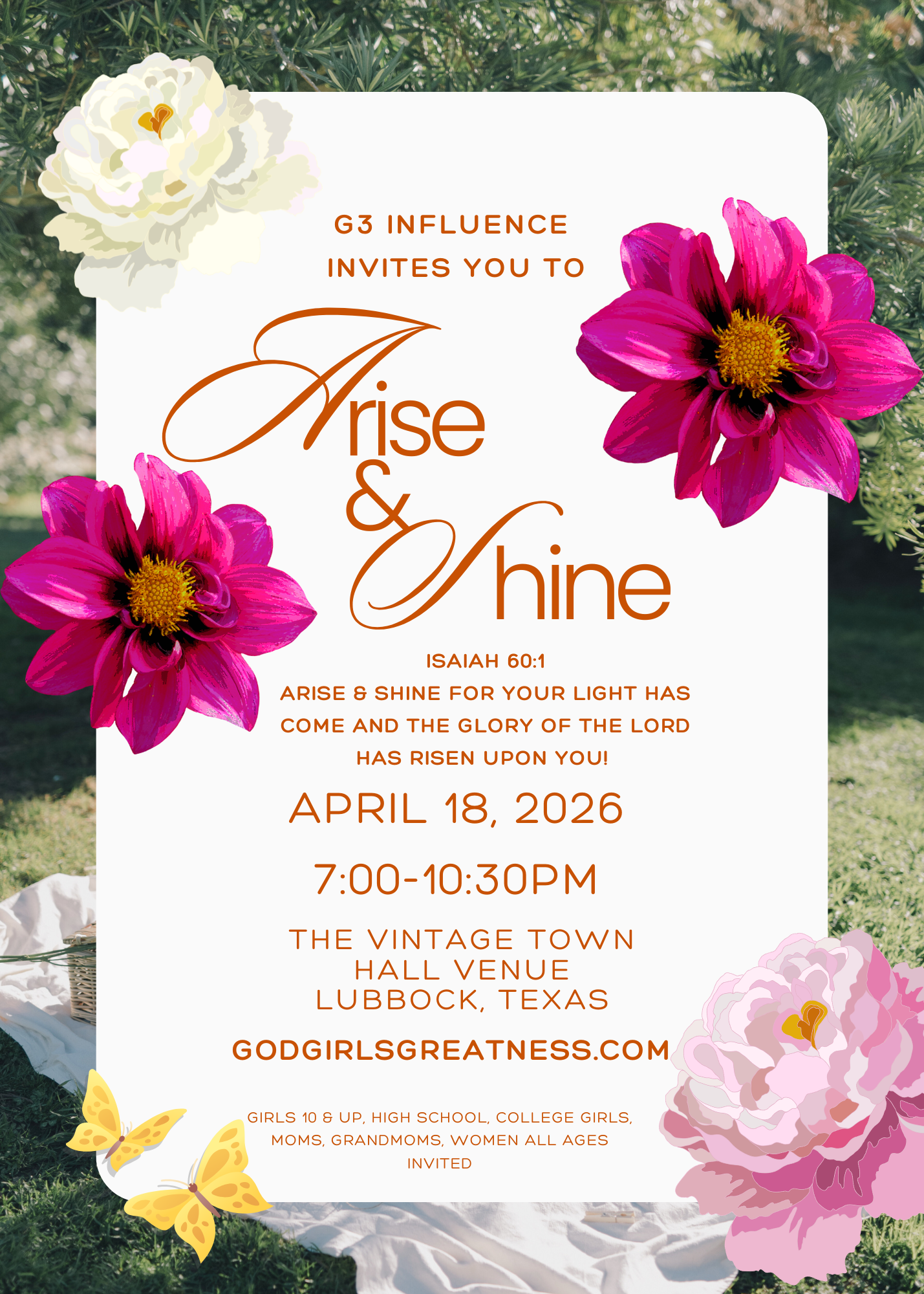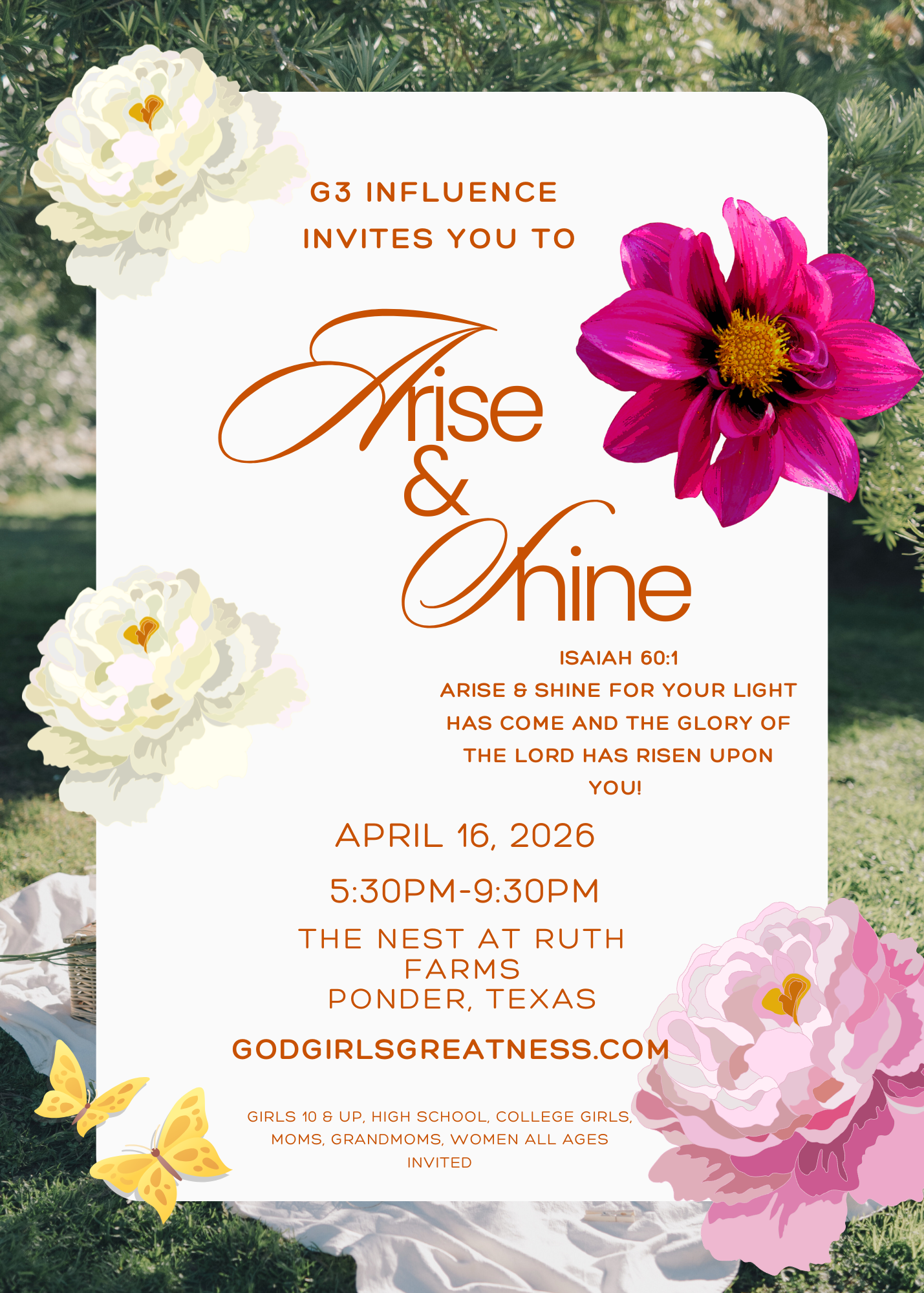 G3 Ministries was founded in 2013 in Keller, Texas. The vision of our ministry is to empower and equip the next generation of young women to walk in their identity , worth and value as a daughter of the Most High King, Jesus.